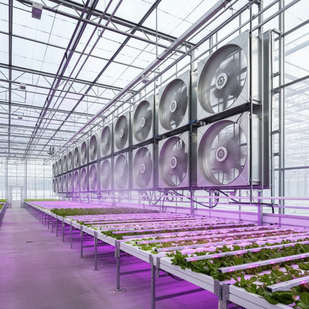 Sistem ventilasi dan pendingin menjadi komponen penting dalam menjaga stabilitas iklim di dalam greenhouse. Ketika suhu meningkat dan sirkulasi udara tidak berjalan lancar, tanaman mengalami stres dan pertumbuhannya menurun. Karena itu, setiap greenhouse membutuhkan ventilasi yang kuat, aliran udara yang terarah, serta pendinginan yang efektif. Dengan pengaturan iklim yang baik, tanaman tumbuh lebih sehat, lebih cepat, dan lebih produktif.